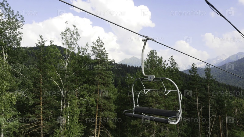 Яркий летний красочный горный пейзаж с голубым облачным небом и лыжным лифтом