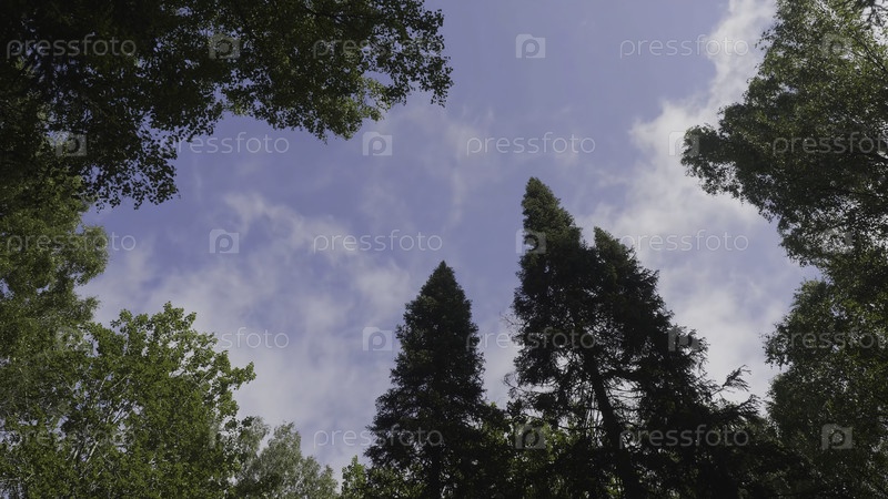 Зеленый лес. Дерево с зелеными листьями внизу является фоновым видом. Вид на высокие старые деревья в вечнозелёном первичном лесу. Голубое небо на заднем плане