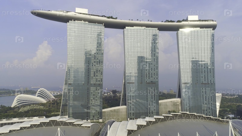 Вид на знаменитый отель в Сингапуре.Стреляйте.Марина-Бэй Сэндс - один из самых известных роскошных отелей в Сингапуре с захватывающим видом на город с вершины