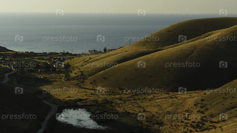 Вид сверху на деревню рядом с морем возле холмов. потрясающий. солнечный день в деревне у моря осенью