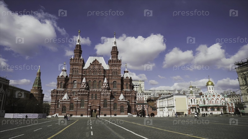 Солнечный летний день на Красной площади в Москве на голубом облачном фоне неба, концепция архитектуры и истории