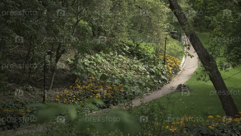 Зеленое травяное поле в большом городском парке. ландшафт травяного поля и зеленая среда общественного парка используются как естественный фон. Красивый зелёный городской парк