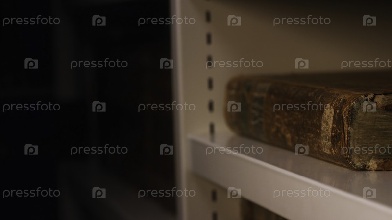 Рука в белой хлопковой перчатке берет старую книгу с книжной полки в музее или частной библиотеке
