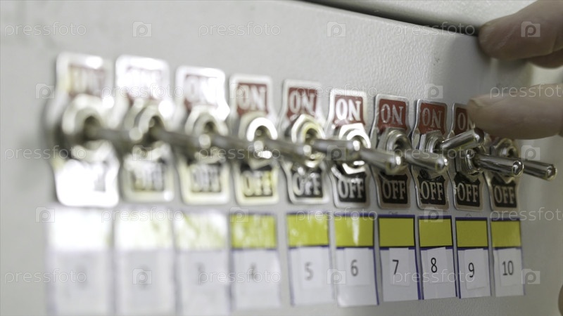 Закройте панель переключателя безопасности. Продолжайте. Ручная панель с выключениями на заводском предохранителе. Рука фабричного работника переходит к кисти