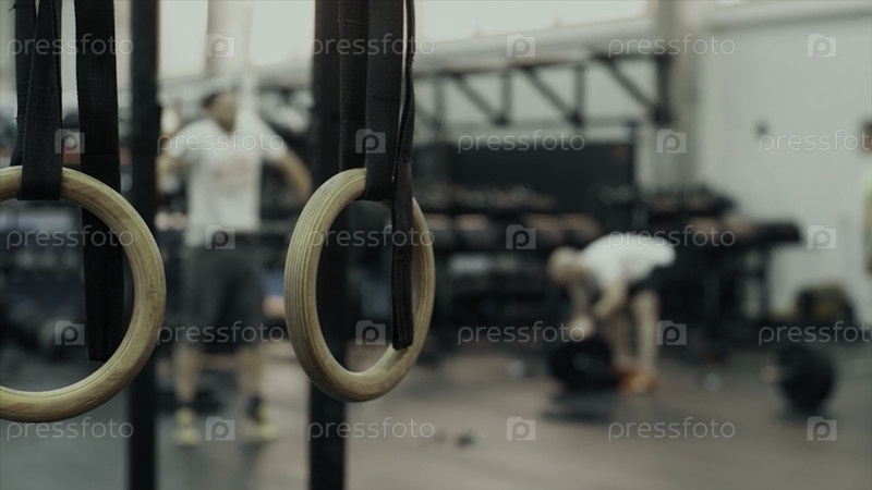 Профессиональное спортивное оборудование и интерьер тренажерного зала. видео. нижний вид гимнастических колец со спортивным потолком зала на фоне