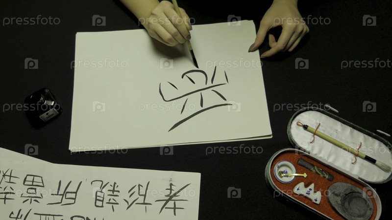 Женская рука пишет китайскую каллиграфию, женщина держит кисть с китайскими символами