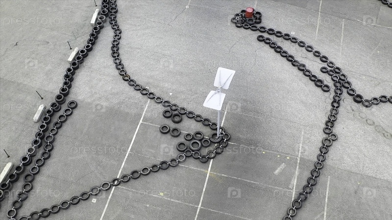 Вид с воздуха на старую картинговую трассу с черными шинами, концепцию автоспорта.Внешняя картинговая дорожка расположена в бетонной парковке