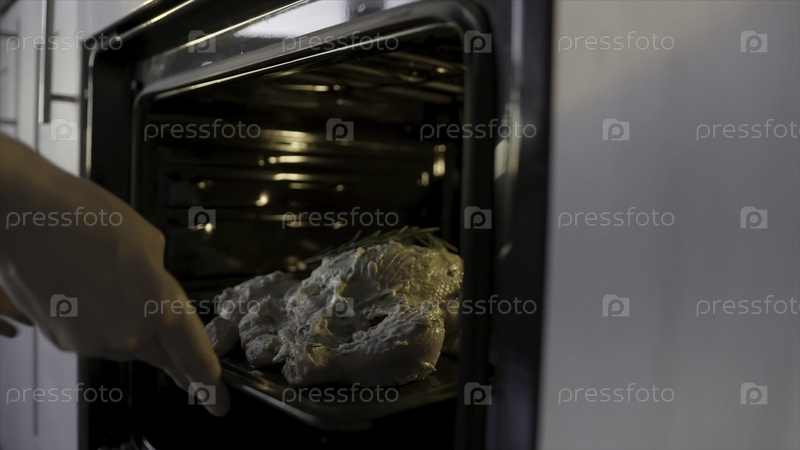 Кухарка кладет сырую курицу с белым майонезным соусом в духовку.Домашняя кулинарная концепция, закройте руки, положив цыпленок розмарина в печь