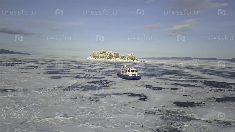 Потрясающая ледяная поверхность пруда, соединенная толстым льдом и движущимся пароходом.Воздушный вид группы туристов, путешествующих внутри автомобиля на воздушно-космическом аппарате над замерзшим озером
