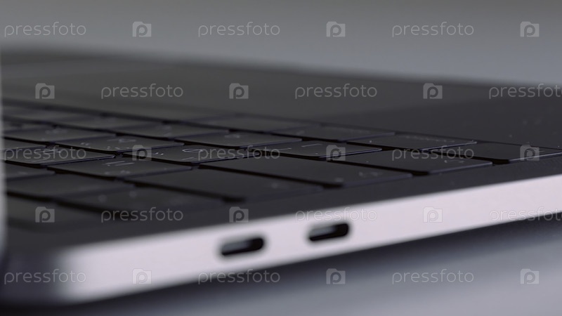 Закройте боковой вид нового ноутбука с черной клавиатурой на белом фоне
