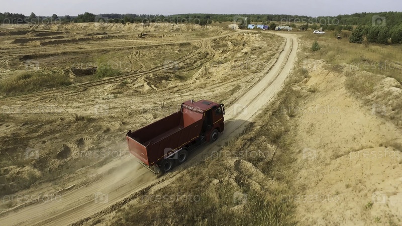 Воздух для большого красного грузовика, едущего в грязном карьере с летящей за ним пылью - это промышленная концепция