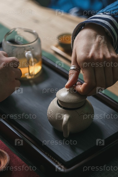 Спокойная и спокойная сцена приготовления чая с красиво выполненным глиняным чайником и деликатной стеклянной кружкой