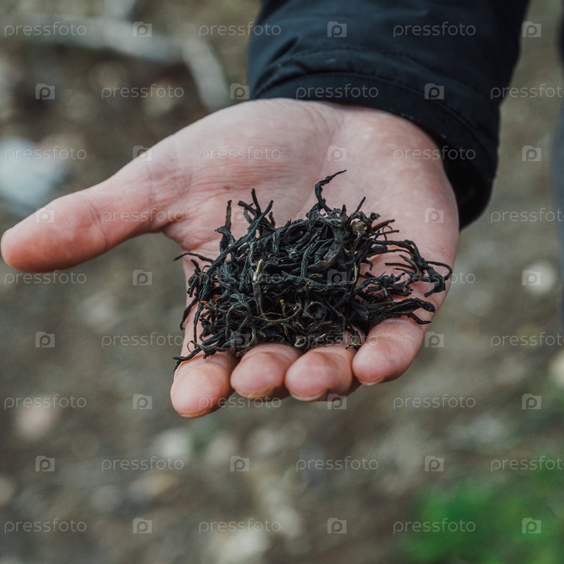 Близкий план руки, демонстрирующей сушеные травы, собранные снаружи и показывающие естественные текстуры