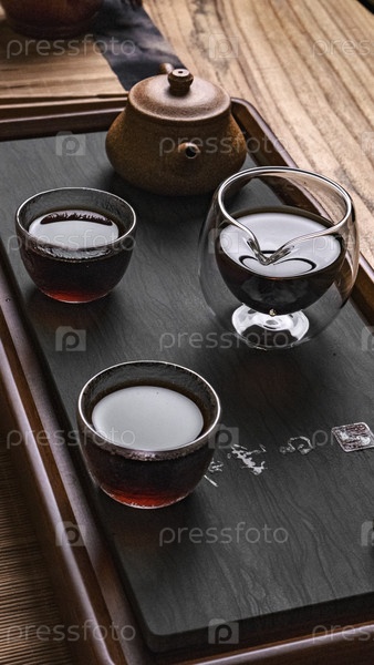 Есть потрясающий и красиво устроенный дисплей чая, представленный в традиционной стеклянной посуде на деревянном подносе