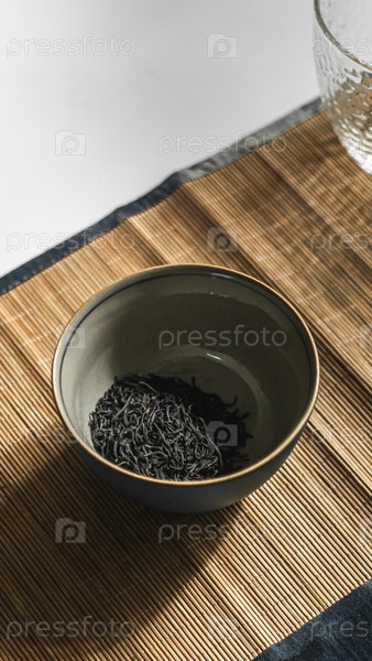 Красивая минималистическая миска, заполненная до краев ароматическими листьями черного чая, опирается на естественный бамбуковый коврик