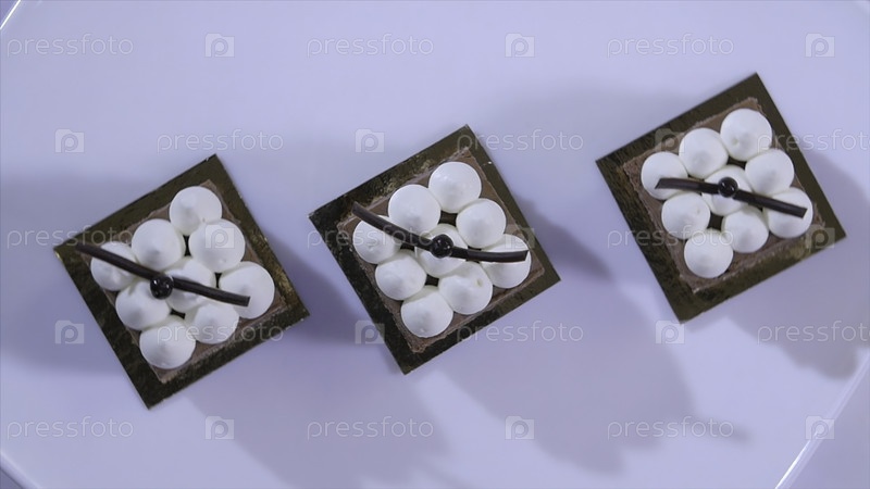 Домашние коричневые торты с ломкой сливочной. Шоколадный торт на белой тарелке со сковородой. Шоколадное десерт. Медленное движение