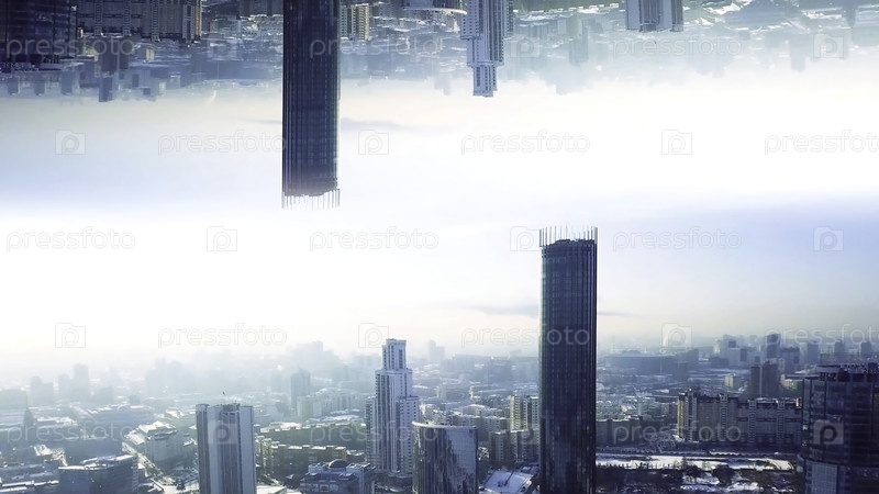 Современный город с зеркальным эффектом. резервные кадры. Абстрактная анимация с эффектом параллельной реальности отраженного мегаполиса. Верхний вид городской панорамы отражался сверху в виде параллельных миров