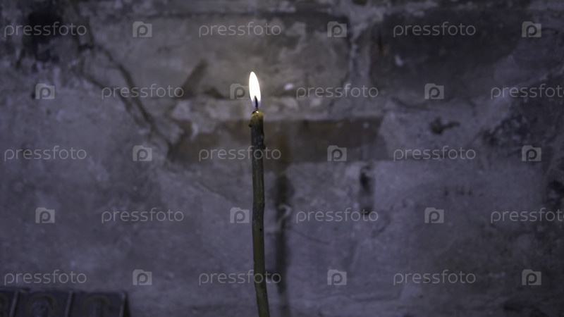 Свеча горит в старой церкви.Снимок.Закрой красивые свечи на темно-сером фоне стены