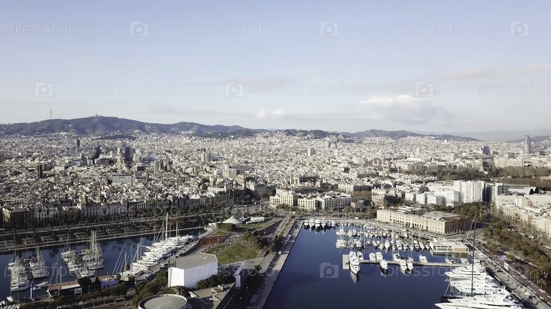 Вид с воздуха на удивительные лодки при закате солнца.Сток.Вид с вершины гавани дронов с яхтой, моторной и парусной шлюпками.Прекрасный порт