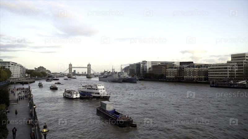 Канал в городе на фоне большого моста с башнями. Идите дальше. Красивый портовый канал расположен в большом городе с красивым мостом. Прекрасный старый архитектурный мост с башнями