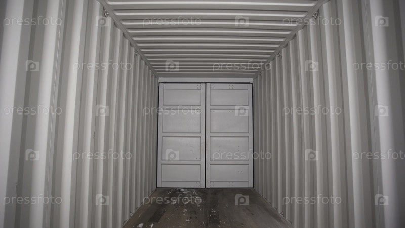 Внутри большого грузового контейнера. Резервные кадры. Вид изнутри запертого грузового контейнера с белыми полосатыми железными стенами. Пустой свет и заблокированный трейлер