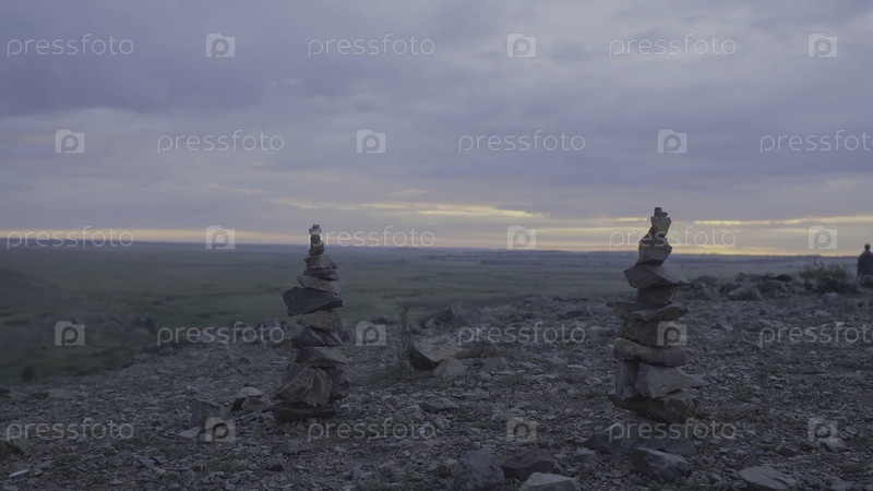Песчаные камни Зенская башня и баланс. кучка камней против неба. каменная башня на фоне поля и утреннего неба
