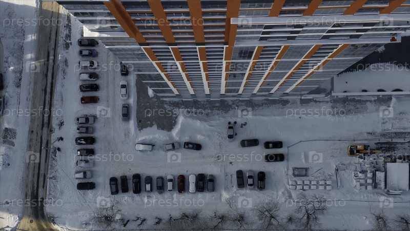Вид с воздуха типичного жилого района со многими автомобилями, припаркованными в высоком здании. видео. детали жилого дома и заснеженной дороги, жизнь большого города зимой