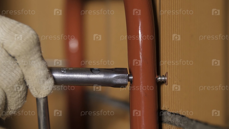 Сборочный взгляд на человека, затягивающего винт внутри красных керамических блоков. Резервные кадры. Работник в процессе прикрепления металлической части к стене