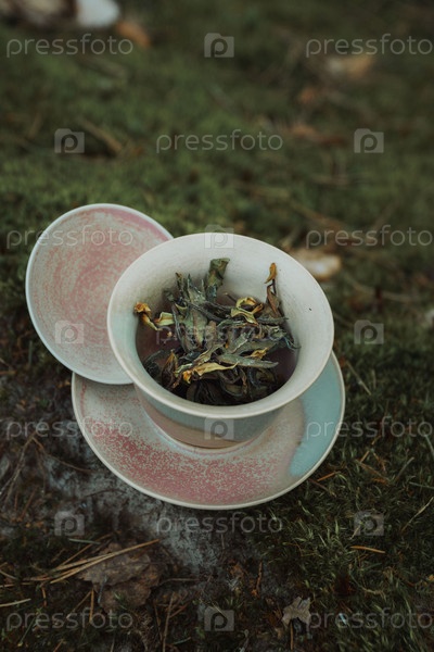 Спокойная миска свежих диких зеленых растений на узорочной керамике, расположенной в естественной среде для идеальной гармонии