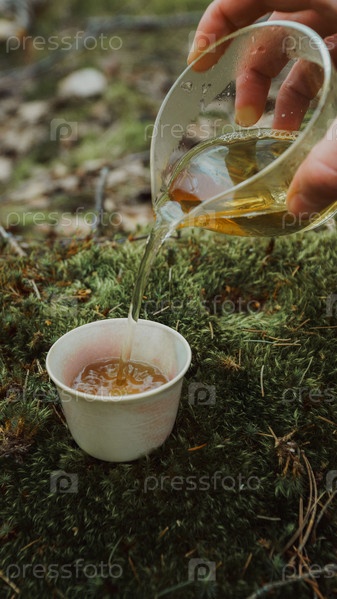 Рука наливает золотую жидкость из кувшина в маленькую чашку в спокойной окружающей среде, окруженной природой
