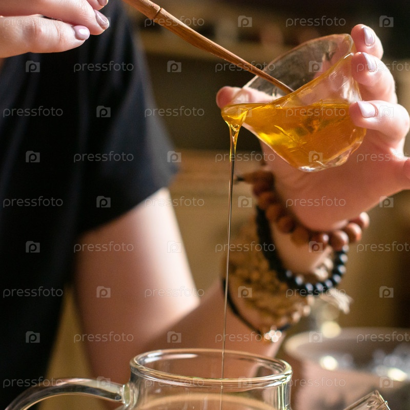 Ремесленник пьет искусство поливания меда в красивом стеклянном чайнике для удовольствия