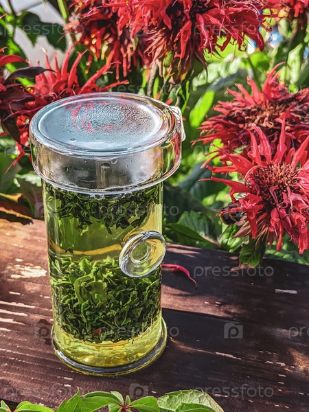 Яркая и ароматная инфузия травяного чая красиво отображается среди пышных зеленых листьев и красочных цветущих цветов