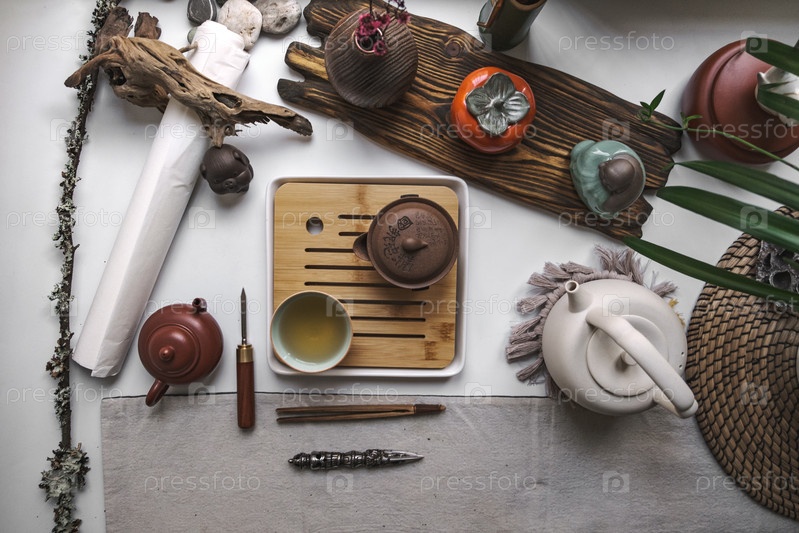 Спокойное расположение чайных аксессуаров с изысканной керамикой, бамбуком и естественным декором для спокойной атмосферы