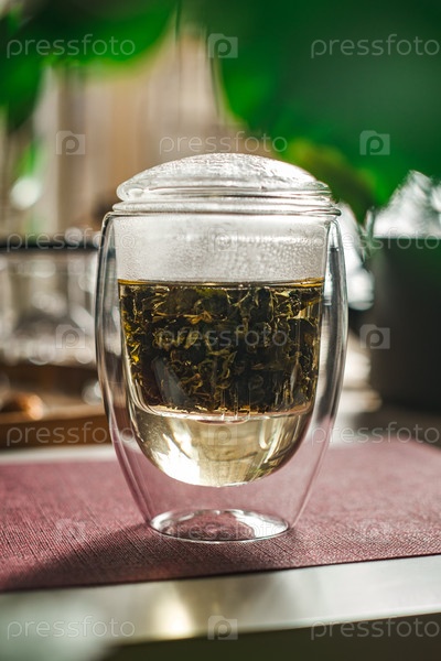 Потрясающий стеклянный чайник элегантно демонстрирует яркую инфузию травяного чая среди пышной зелени позади