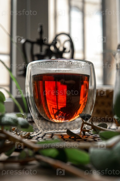 Уютный стакан возвышающегося чая, гармонично отражающий теплые цвета среди красиво устроенного естественного декора
