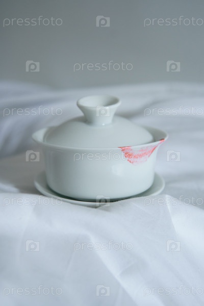 Элегантные блюда из белого фарфора с крышкой и оттиском помады, опирающиеся на мягкую и роскошную ткань