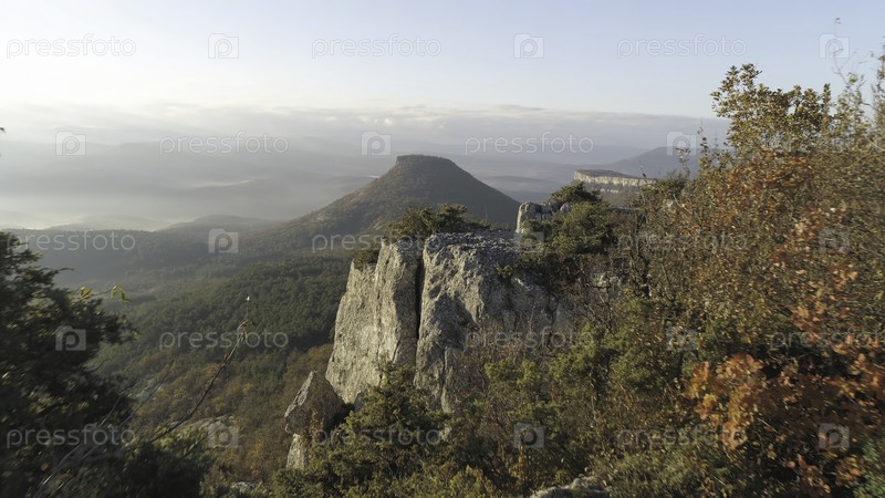 Вид с обрыва на гору, над облаками.Осенний горный пейзаж