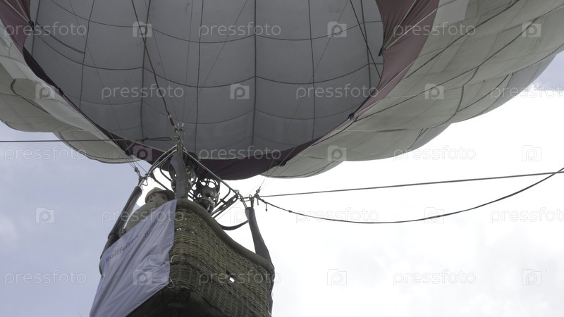 Закройте воздушный шар, летящий в небе.Летающий баллон с корзиной против голубого неба вид снизу