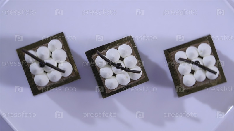 Домашние коричневые торты с ломкой сливочной. Шоколадный торт на белой тарелке со сковородой. Шоколадное десерт. Медленное движение