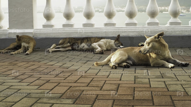 Бродячие собаки на набережной. СМИ. Уличные грязные собаки лежат на набережной. Милые собаки лежат на уличных плитках в летний день. Три уличные собаки