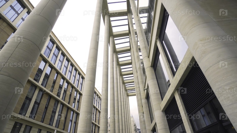 Красивая колоннада современного делового здания. Идите дальше. Внешний коридор с рядами столбов бизнес-центра. Древние решения в архитектуре современных зданий