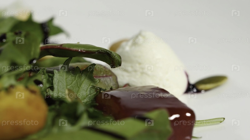 Итальянский салат из жареной свеклы. Жареный салат из свеклы с козьим сыром и сосновыми орехами на белом блюде, изолированный на белом фоне. Таглиателле с свеклой и сыром на тарелке, мягкий фокус