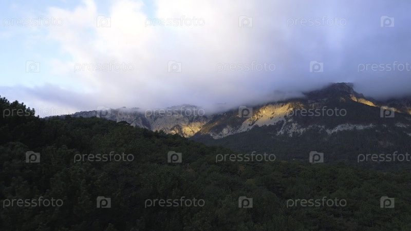 Вид с воздуха зеленого леса возле высоких горных склонов над голубым облачным небом в летний день