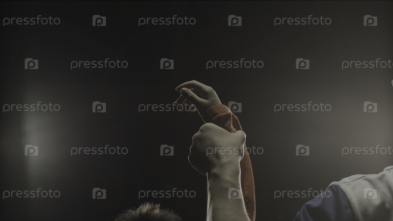 Сзади изображение судьи, который поднимает руку победителю