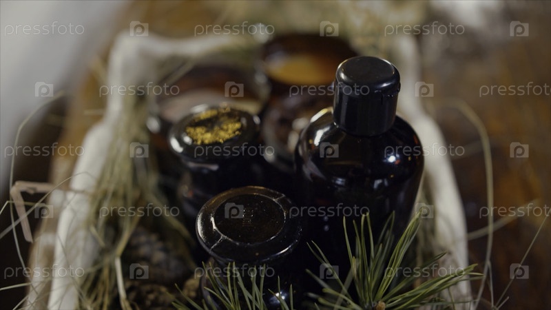 Ароматерапевтический стол с ароматическими свечами, бутылкой из масла и хвойной ветвью с созревающими конусами для создания настроения.Видео.Закрытие декоративной коробочки с натуральными свечами и маслом на фоне деревянного стола