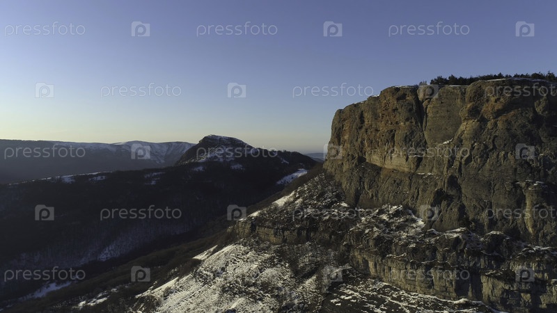 Ландшафт, покрытый снежными камнями в солнечный день на фоне голубого неба. Снимайте. Вид с воздуха на прозрачные скалы и зелёный густой лес, расположенные на их склонах и вниз в ущелье
