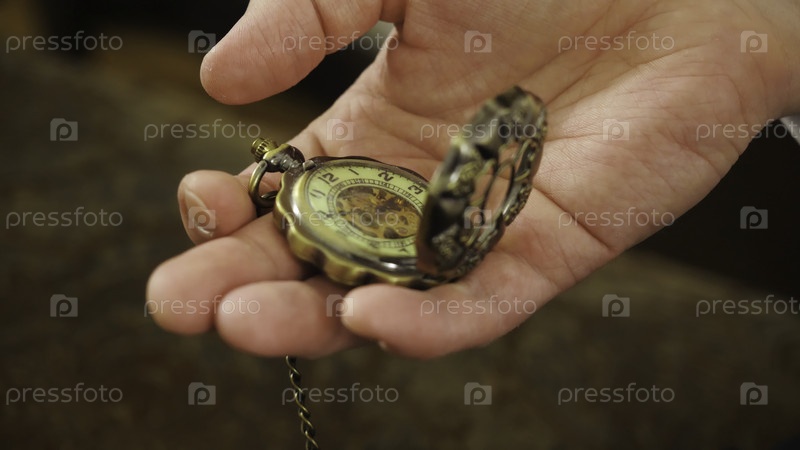 Мужчина держит старые часы. резервные записи. Близкий план красивых наручных часов с узорами на крышке. Далее мужчина смотрит на старые ручные часы