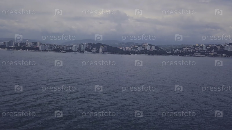 Яхта на фоне побережья с городом в пасмурную погоду. Клип. Вид на морской пейзаж с одиноким берегом яхты и темным небом