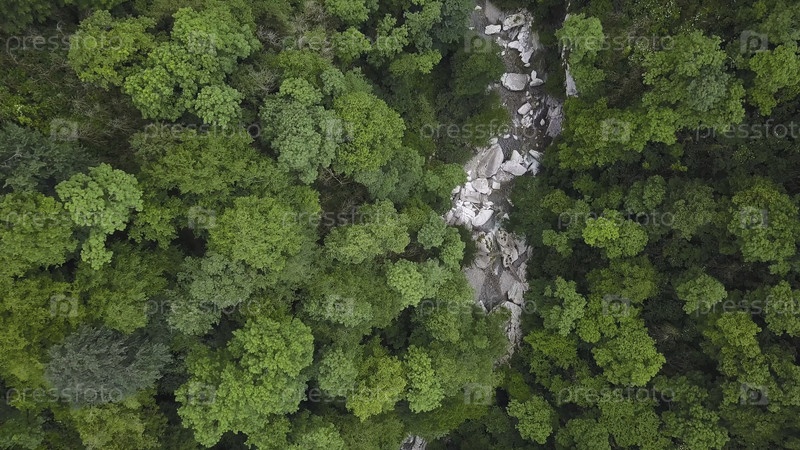 Горная река течет сквозь валуны и зеленый лес. Клип. Вид на зелёную лесною долину с горным ручьем, протекающим через скалистые скалы