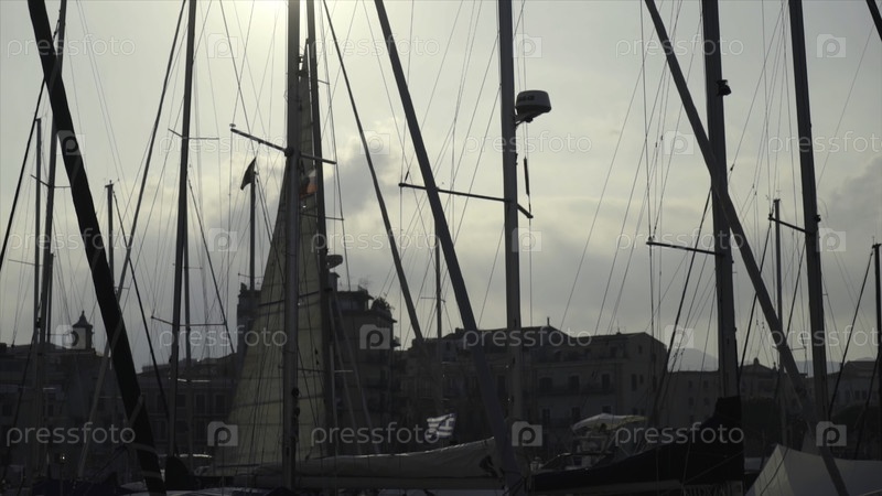 Прекрасный вид на мачты кораблей на фоне солнца и голубого неба